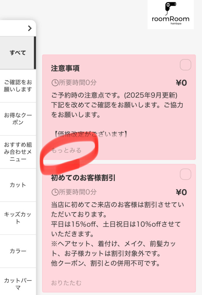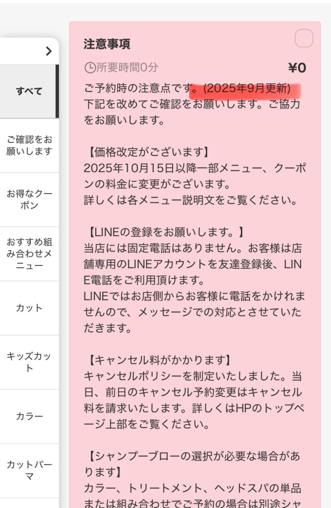 現在、ほとんどの方がネット予約で予約を取っていただけていますが、お客様自身の操作でメニュー選択の間違いなどもしばしばございますのでご注意ください。